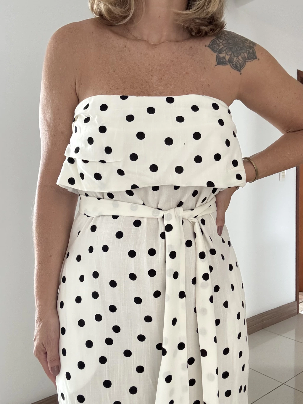 Uma vestido feito em tecido viscose + linho na estampa Póa. Modelo tomara que caia, fecho atrás, faixa do produto tecido pra amarrar a cintura, bolso nas laterais e comprimento Mídi.